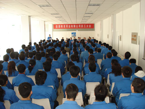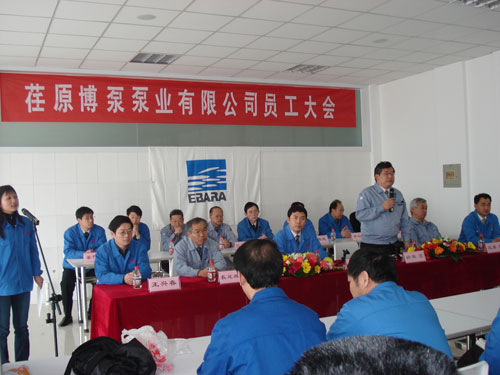 公司常務(wù)副總經(jīng)理鈴木宏先生主持大會并感謝大家經(jīng)過各方面的努力,使公司建成投產(chǎn)。人力資源部部長姜作棟先生將公司機(jī)構(gòu)設(shè)置、部門人員安排及請假制度等作了介紹;總經(jīng)理助理、公司辦公室主任劉擁民先生將公司員工行為準(zhǔn)則作了介紹;最后,總經(jīng)理孫龍平先生講話,孫總談到:荏原博泵泵業(yè)有限公司是日本荏原制作所與山東博泵科技股份有限公司的強(qiáng)強(qiáng)聯(lián)合。1912年做為泵的制造商起家,隨后發(fā)展成為工業(yè)機(jī)械界帶頭企業(yè)的日本荏原以其雄厚的技術(shù)實(shí)力,成為世界最大的單一泵制造廠家。而成立于1929年的山東博泵科技股份有限公司,在70多年專業(yè)生產(chǎn)水泵的基礎(chǔ)上,成為中國泵行業(yè)的佼佼者,并建立了遍布全中國的銷售網(wǎng)絡(luò)。荏原博泵泵業(yè)有限公司的建成投產(chǎn),將在優(yōu)勢互補(bǔ)的基礎(chǔ)上,發(fā)展成為高科技、高品質(zhì)的世界級一流企業(yè)。