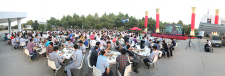 下午5點(diǎn),在夕陽(yáng)的映照中,公司辦公樓前,忙碌的員工穿梭在會(huì)場(chǎng),辦公樓南面已搭建好舞臺(tái),碩大的LED屏矗立在舞臺(tái)上。舞臺(tái)兩側(cè)各豎立著兩個(gè)團(tuán)結(jié)柱。舞臺(tái)前的空地上,已擺放好63張桌子,每張桌子配放6把椅子。桌子上,豐盛的飯菜已放好,靠西邊的草坪旁,是備好的新鮮的青島扎啤。