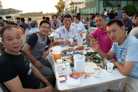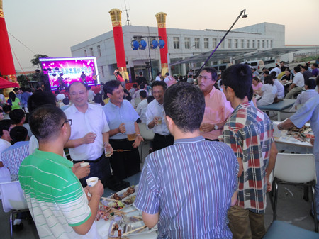 17:30,志賀進(jìn)總經(jīng)理端著酒杯,走到舞臺(tái)前,首先感謝廣大員工的辛勤努力,使公司取得很好的業(yè)績(jī),隨著一聲“干杯”,荏原博泵第五屆納涼晚會(huì)拉開(kāi)了序幕。公司380多名員工,分部門(mén)有序而坐,大家推杯換盞,興高采烈。公司領(lǐng)導(dǎo)挨桌給員工們敬酒,大家沒(méi)有了上下級(jí)的拘謹(jǐn),一派歡樂(lè)祥和的景象。
